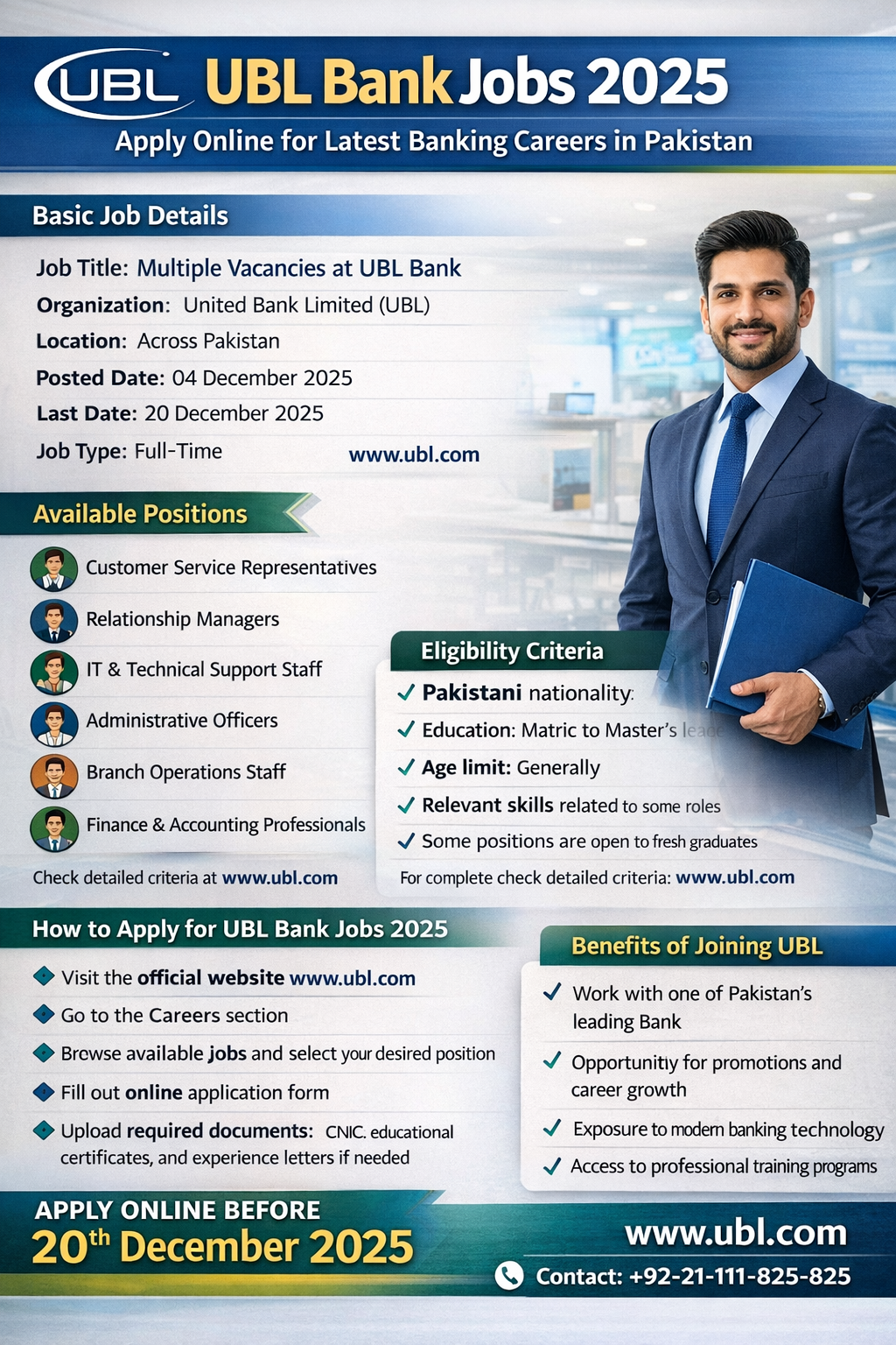 Explore the latest UBL Bank Jobs 2025 and apply online now! Discover exciting career opportunities, eligibility criteria, and how to submit your application. Don’t miss out on joining Pakistan’s leading banking organization. Basic Job Details Field Information Job Title Multiple Vacancies at UBL Bank Organization United Bank Limited (UBL) Location Nationwide (Pakistan) Posted Date 04 December 2025 … Read more