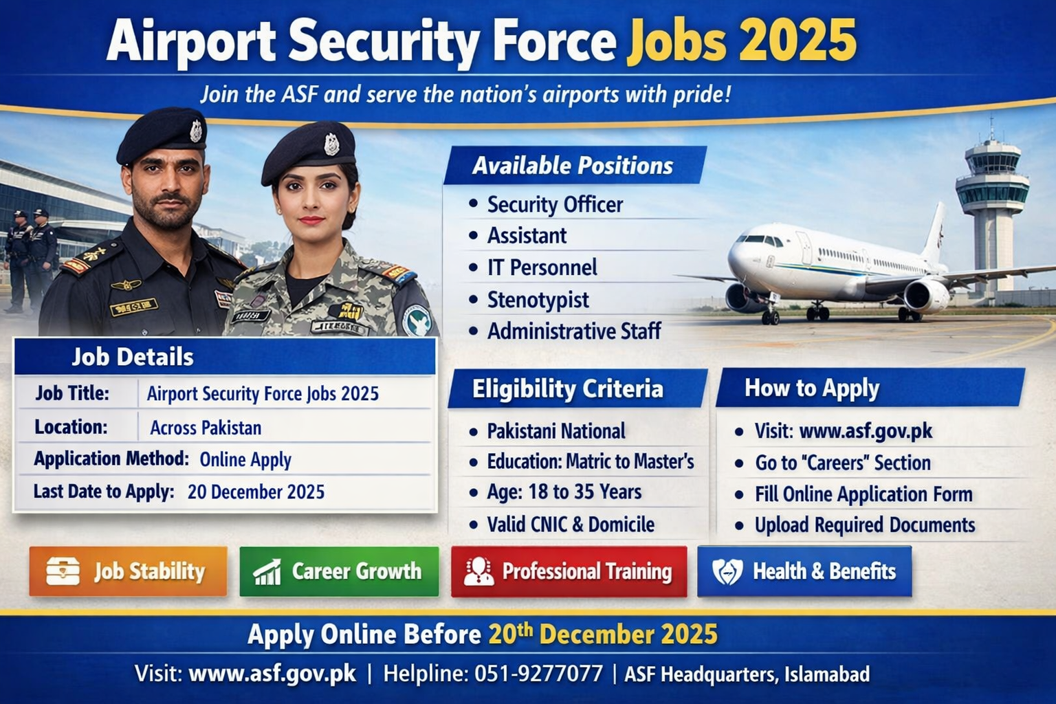 Looking for Airport Security Force Jobs 2025? Apply online now for the latest vacancies across Pakistan. Find eligibility, how to apply, and official contact details here. Basic Job Details Field Information Job Title Airport Security Force Jobs 2025 Organization Airport Security Force (ASF) Location Various regions across Pakistan Employment Type Full-Time Application Method Online Submission … Read more